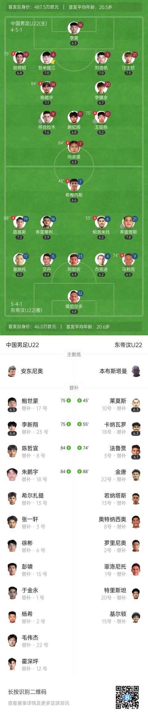 本场比赛U22国足首发为:16-李昊、4-吾米提江、5-刘浩帆、19-胡荷韬、21-汪士钦、10-王钰栋、11-蒯纪闻、14-杨皓宇、20-李镇全、7-向余望、9-拜合拉木。